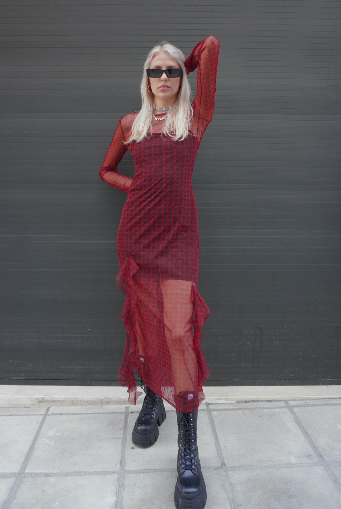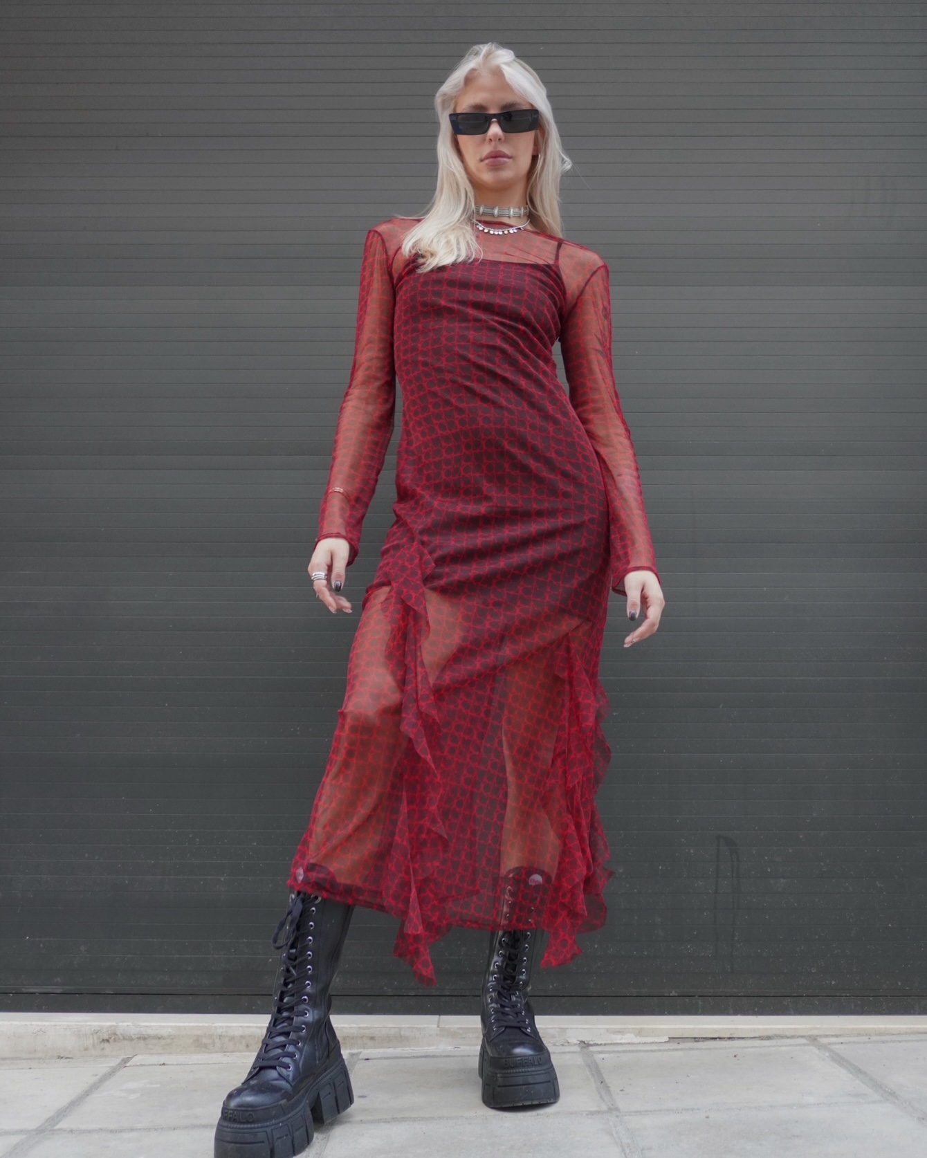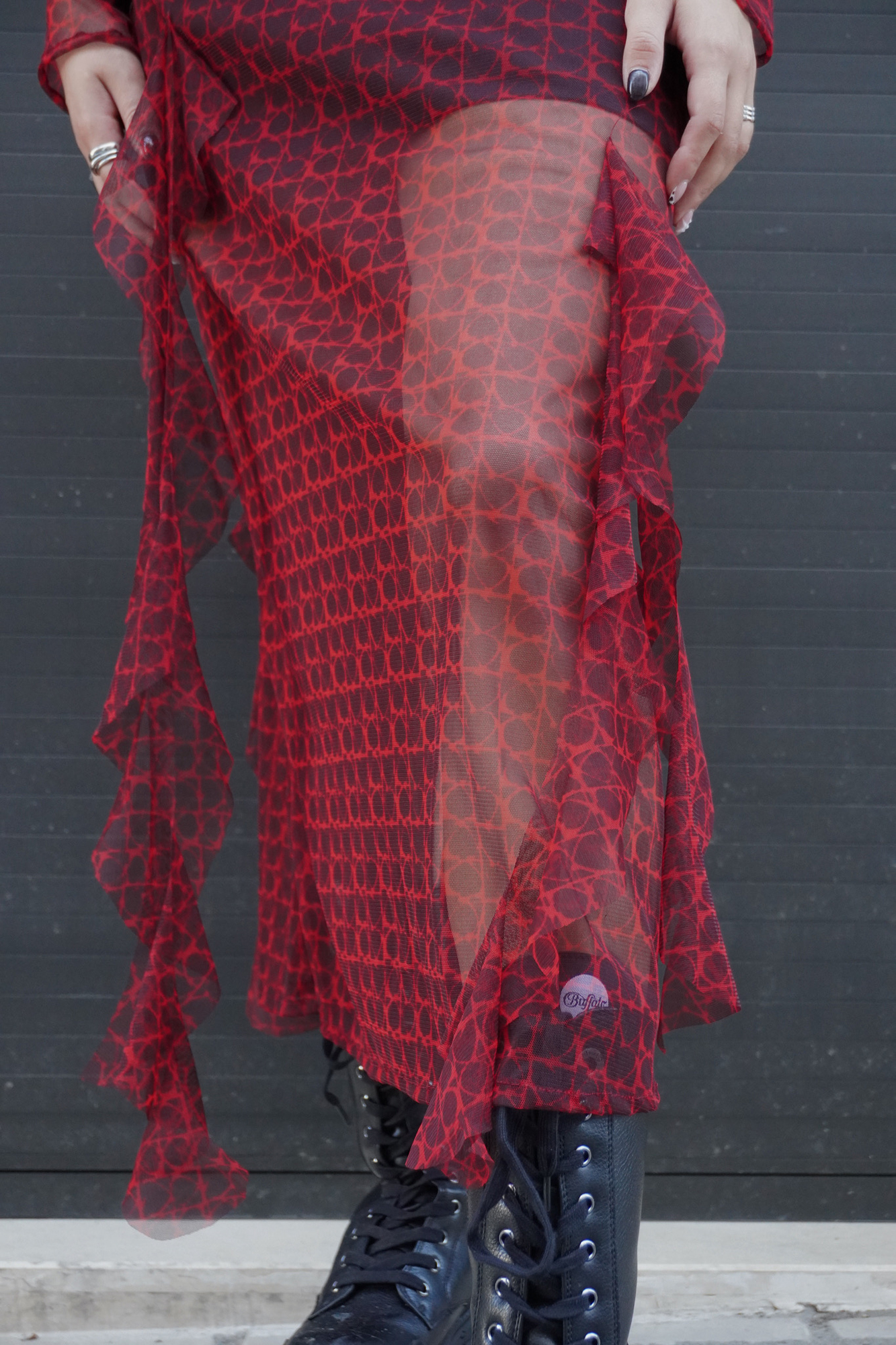 Elastic see-through mesh dress with ruffles (black dress inside not included).