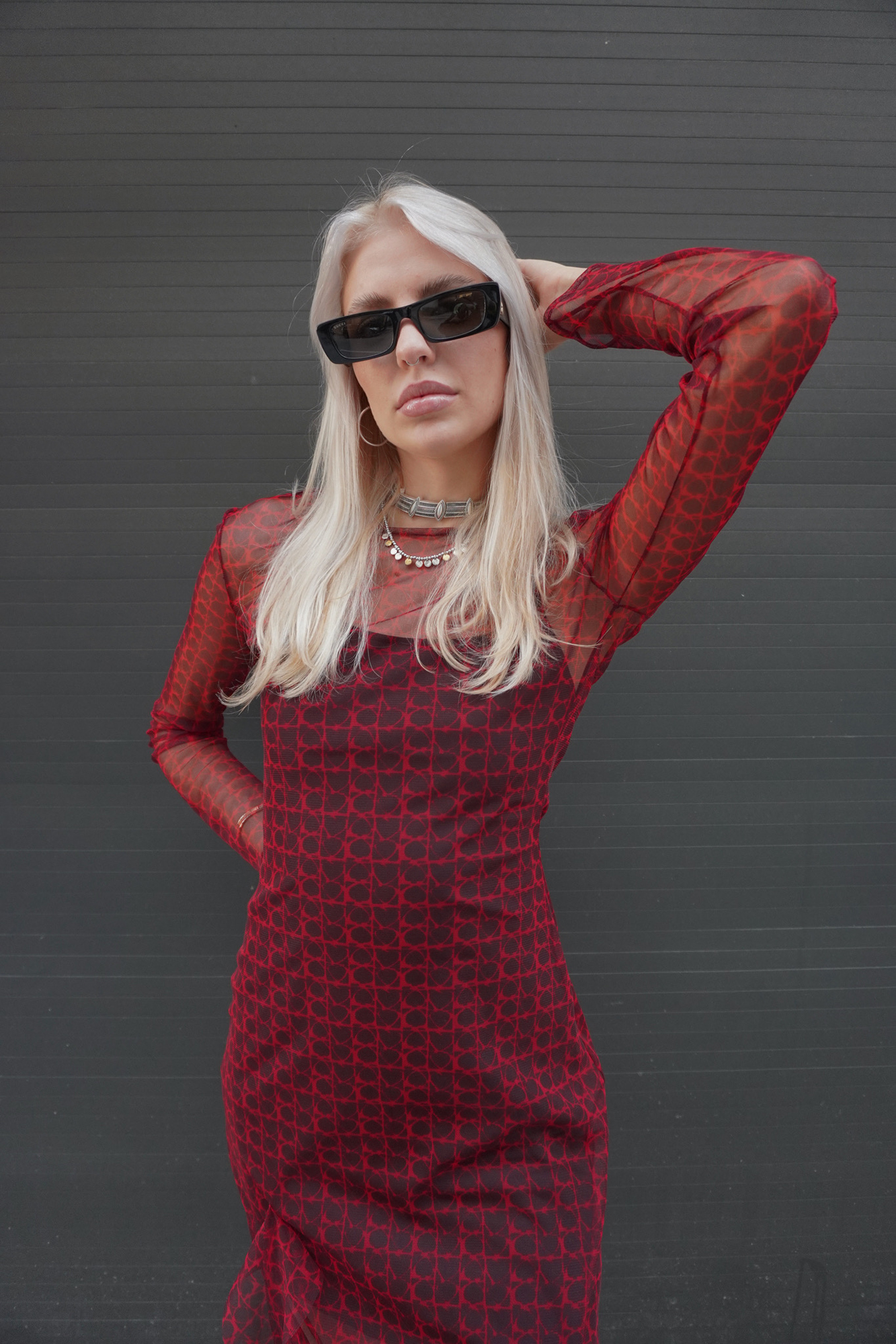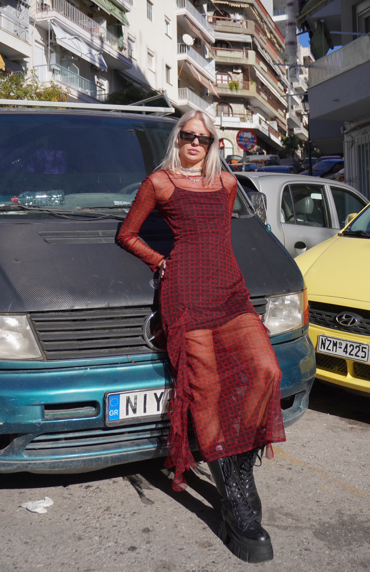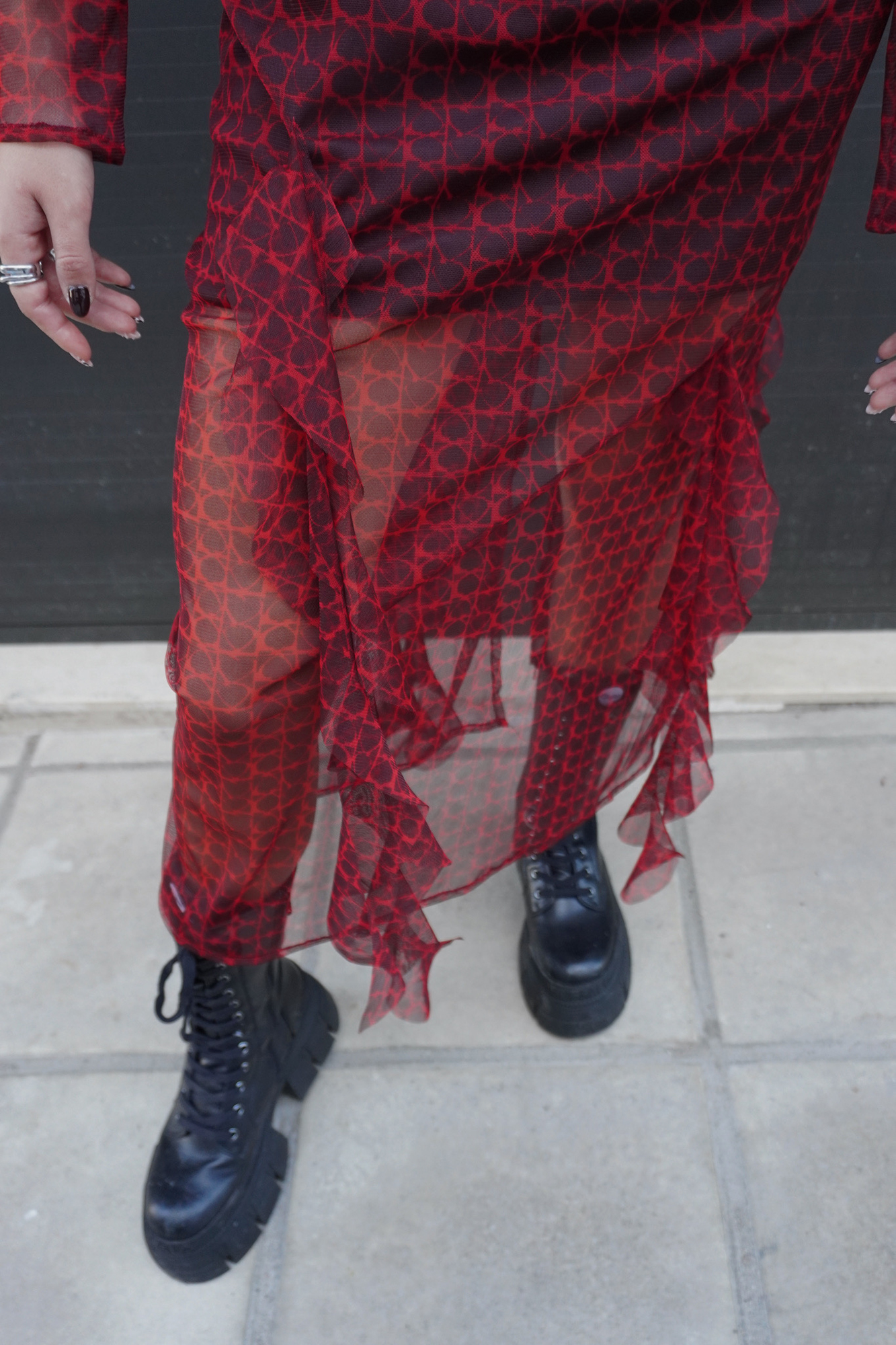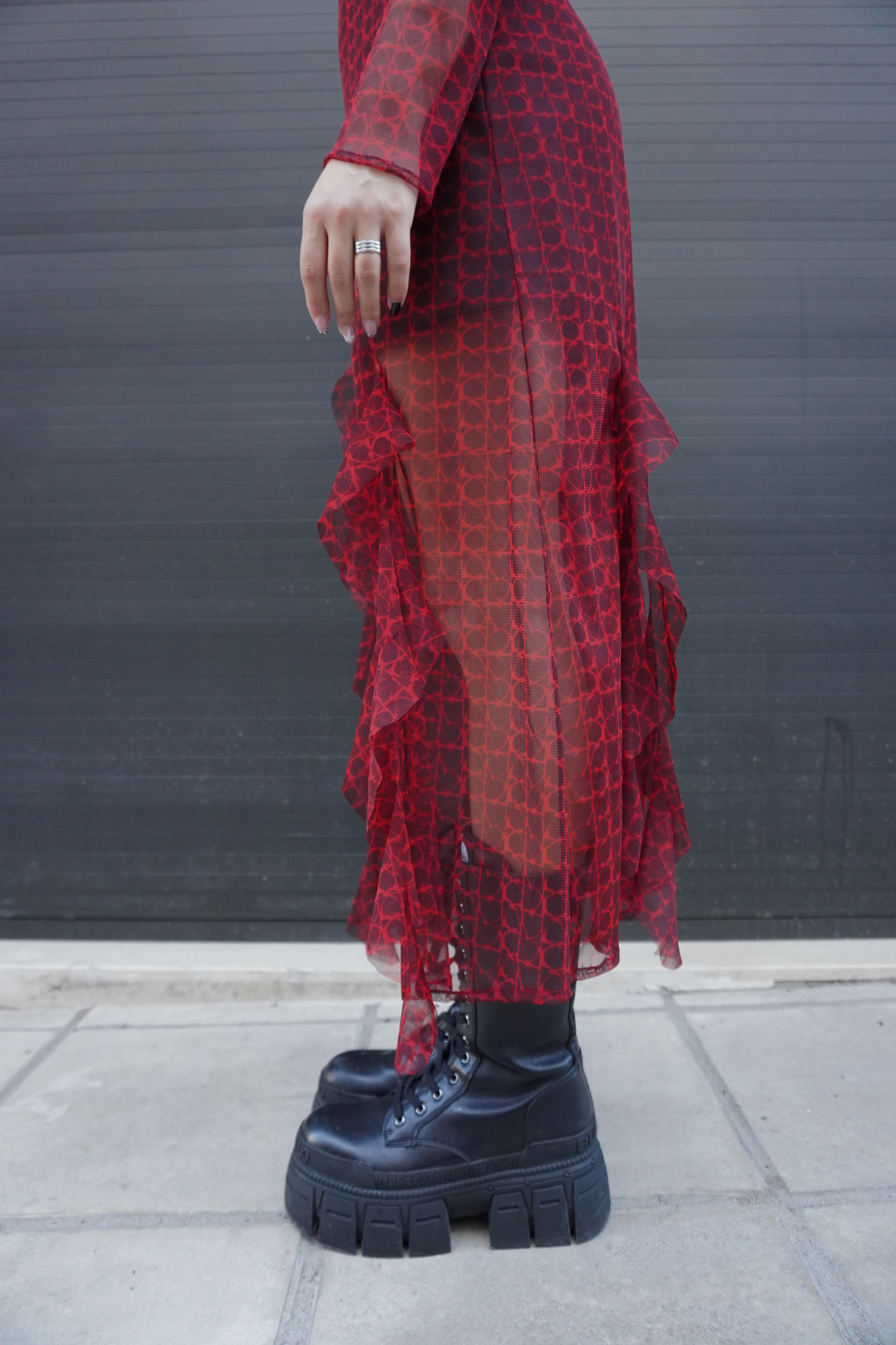 Elastic see-through mesh dress with ruffles (black dress inside not included).